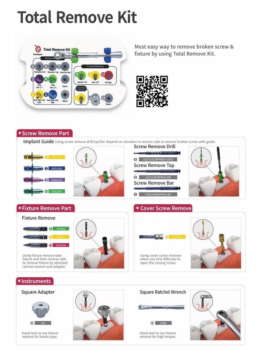 Setul de îndepărtare a implantului și șuruburilor este utilizat pentru îndepărtarea implanturilor eșuate, a șuruburilor decapate și a șuruburilor fracturate. Sunt furnizate trei dimensiuni de dispozitive de îndepărtare, asigurând îndepărtarea implantului de orice dimensiune. Dispozitivele de îndepărtare a dispozitivului se încrucișează cu firele interne ale oricărui implant, fuzionand cele două piese împreună. Sunt incluse o varietate de instrumente pentru îndepărtarea șuruburilor, care permite medicilor să îndepărteze atât șuruburile protetice fracturate, cât și cele decapate. Acest kit oferă tot ce aveți nevoie pentru a îndepărta implanturile și șuruburile, ceea ce îl face un plus esențial pentru orice practică de implantare.